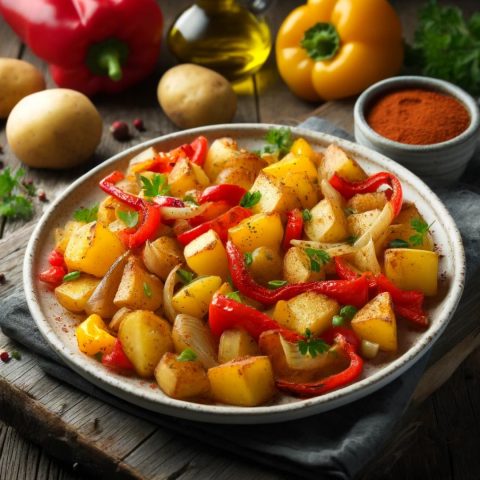 Añadir pimientos y cebolla: Añade los pimientos morrones y la cebolla a la sartén con las papas. Cocina por otros 5-7 minutos, hasta que las verduras estén tiernas.